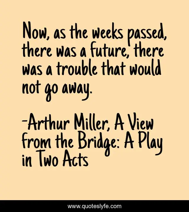 This page presents the quote "Now, as the weeks passed, there was a future, there was a trouble that would not go away.". Author of this quote is Arthur Miller, A View from the Bridge: A Play in Two Acts. .