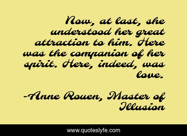 This page presents the quote "Now, at last, she understood her great attraction to him. Here was the companion of her spirit. Here, indeed, was love.". Author of this quote is Anne Rouen, Master of Illusion. This quote is about historical-fiction, historical-romance,.
