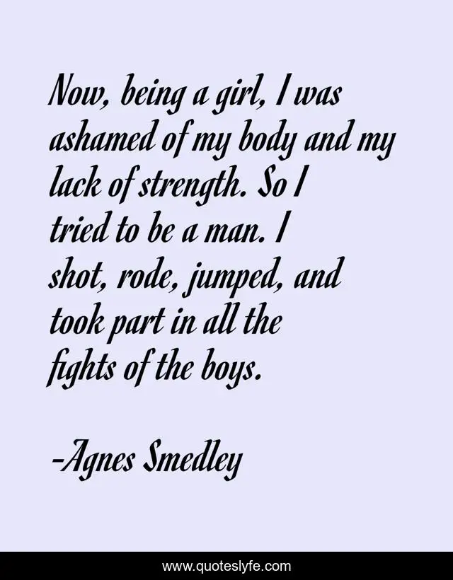 This page presents the quote "Now, being a girl, I was ashamed of my body and my lack of strength. So I tried to be a man. I shot, rode, jumped, and took part in all the fights of the boys.". Author of this quote is Agnes Smedley. This quote is about body, girl, man,.