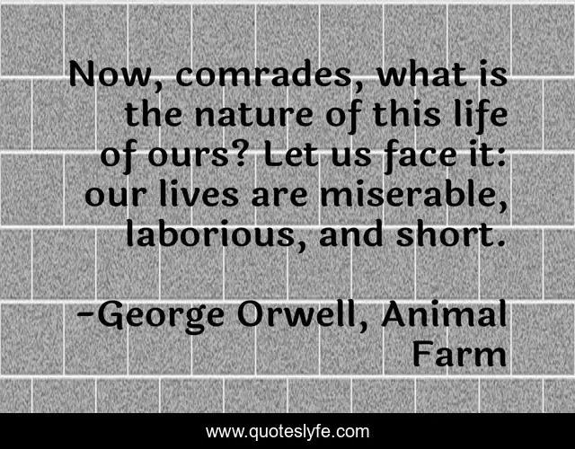 This page presents the quote "Now, comrades, what is the nature of this life of ours? Let us face it: our lives are miserable, laborious, and short.". Author of this quote is George Orwell, Animal Farm. This quote is about life, misery,.