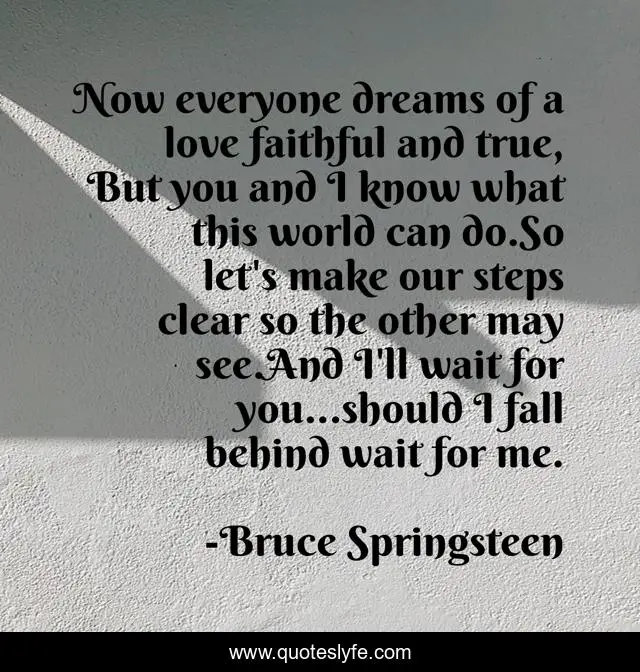 This page presents the quote "Now everyone dreams of a love faithful and true, But you and I know what this world can do.So let's make our steps clear so the other may see.And I'll wait for you...should I fall behind wait for me.". Author of this quote is Bruce Springsteen. This quote is about commitment, song-lyrics,.