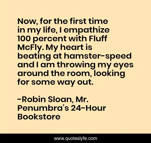 This page presents the quote "Now, for the first time in my life, I empathize 100 percent with Fluff McFly. My heart is beating at hamster-speed and I am throwing my eyes around the room, looking for some way out.". Author of this quote is Robin Sloan, Mr. Penumbra's 24-Hour Bookstore. This quote is about nerves, stress, humor, hamsters,.
