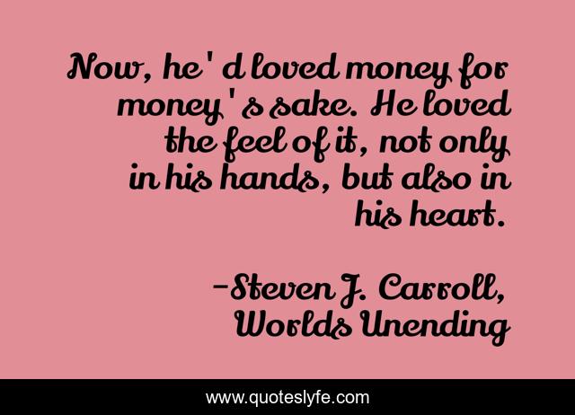 This page presents the quote "Now, he'd loved money for money's sake. He loved the feel of it, not only in his hands, but also in his heart.". Author of this quote is Steven J. Carroll, Worlds Unending. This quote is about selfishness, middle-grade, middle-grade-fantasy, greed, money,.
