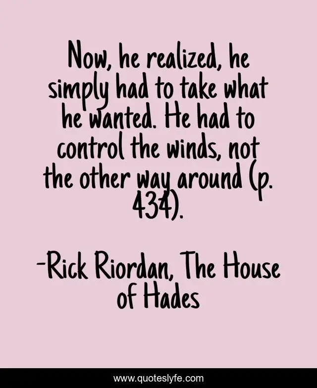 This page presents the quote "Now, he realized, he simply had to take what he wanted. He had to control the winds, not the other way around (p. 434).". Author of this quote is Rick Riordan, The House of Hades. This quote is about enthusiasm, decisions, inspirational,.