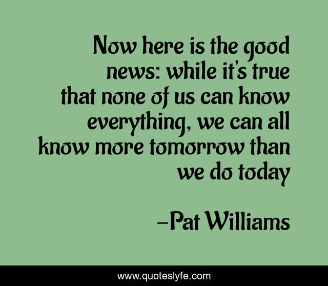 This page presents the quote "Now here is the good news: while it's true that none of us can know everything, we can all know more tomorrow than we do today". Author of this quote is Pat Williams. This quote is about knowledge, self-improvement,.