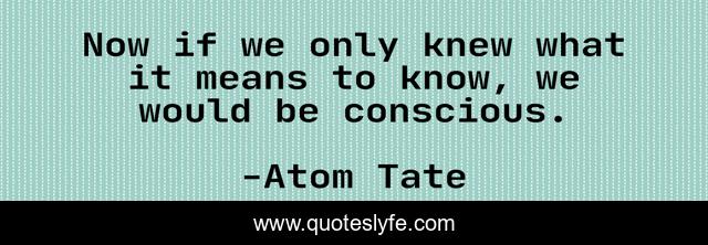 This page presents the quote "Now if we only knew what it means to know, we would be conscious.". Author of this quote is Atom Tate. This quote is about duty, knowledge, consciousness, subconscious, meaning, responsibility, truth, existence,.