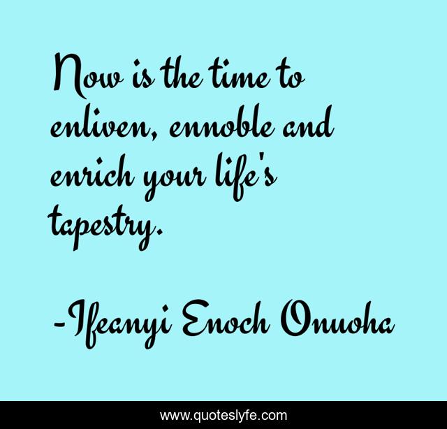 This page presents the quote "Now is the time to enliven, ennoble and enrich your life's tapestry.". Author of this quote is Ifeanyi Enoch Onuoha. This quote is about motivation, hinovelty, higherlife-coach, life-living, wisdom, leagacy, excellence, inspirational, enthusiasm,.