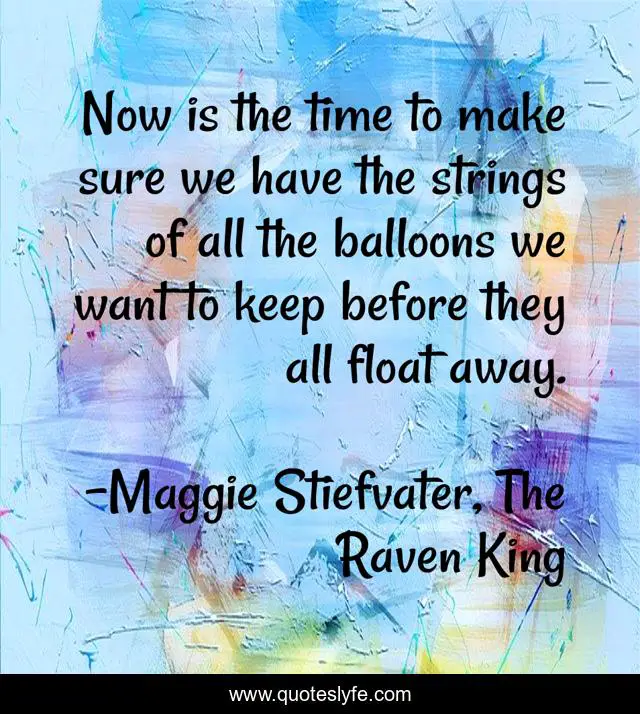 This page presents the quote "Now is the time to make sure we have the strings of all the balloons we want to keep before they all float away.". Author of this quote is Maggie Stiefvater, The Raven King. This quote is about friends, change, graduation,.