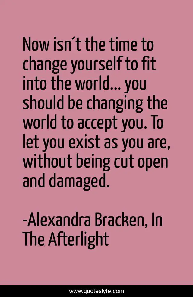 This page presents the quote "Now isn´t the time to change yourself to fit into the world... you should be changing the world to accept you. To let you exist as you are, without being cut open and damaged.". Author of this quote is Alexandra Bracken, In The Afterlight. This quote is about no-one-is-insignificant, change-the-world, enthusiasm, inspirational, world,.