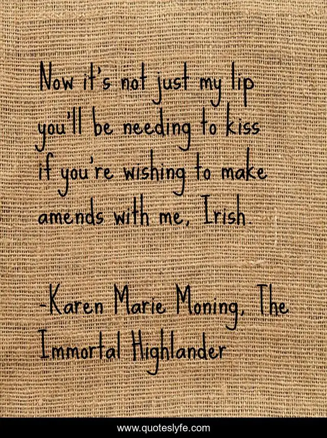 This page presents the quote "Now it's not just my lip you'll be needing to kiss if you're wishing to make amends with me, Irish.". Author of this quote is Karen Marie Moning, The Immortal Highlander. This quote is about the-immortal-highlander, amends, gabby, adam, kiss, karen-marie-moning,.