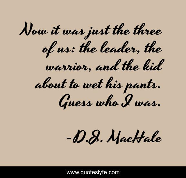 This page presents the quote "Now it was just the three of us: the leader, the warrior, and the kid about to wet his pants. Guess who I was.". Author of this quote is D.J. MacHale. This quote is about funny, comedy,.