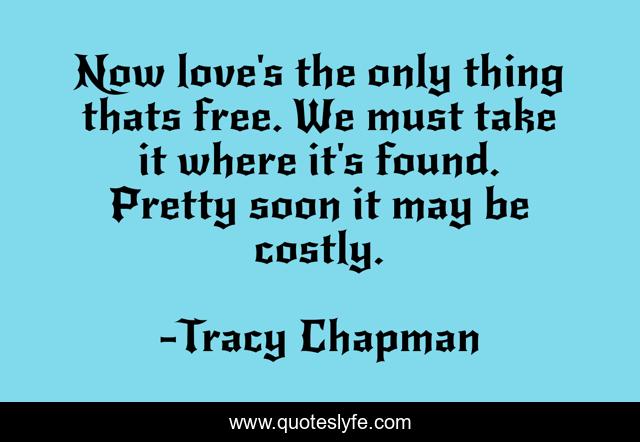 This page presents the quote "Now love's the only thing thats free. We must take it where it's found. Pretty soon it may be costly.". Author of this quote is Tracy Chapman. This quote is about found, love, free, affection,.