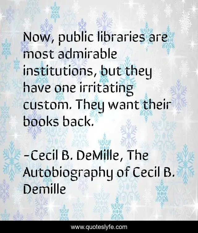 "Cecil B. DeMille, The Autobiography of Cecil B. Demille Quotes." Quoteslyfe.com, 2025. Mon. 08 Dec. 2025. <https://www.quoteslyfe.com/quote/Now-public-libraries-are-most-admirable-institutions-43522>.
