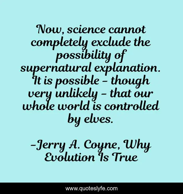 This page presents the quote "Now, science cannot completely exclude the possibility of supernatural explanation. It is possible - though very unlikely - that our whole world is controlled by elves.". Author of this quote is Jerry A. Coyne, Why Evolution Is True. .