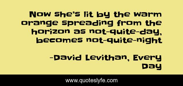 This page presents the quote "Now she’s lit by the warm orange spreading from the horizon as not-quite-day, becomes not-quite-night". Author of this quote is David Levithan, Every Day. This quote is about every-day, light, david-levithan, sunset, night, day,.