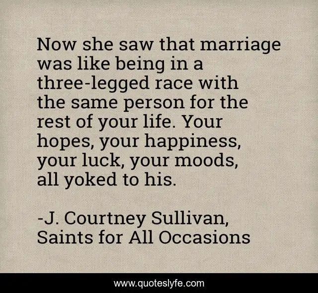 This page presents the quote "Now she saw that marriage was like being in a three-legged race with the same person for the rest of your life. Your hopes, your happiness, your luck, your moods, all yoked to his.". Author of this quote is J. Courtney Sullivan, Saints for All Occasions. .