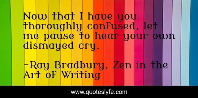 This page presents the quote "Now that I have you thoroughly confused, let me pause to hear your own dismayed cry.". Author of this quote is Ray Bradbury, Zen in the Art of Writing. .