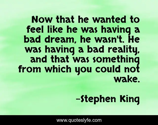 This page presents the quote "Now that he wanted to feel like he was having a bad dream, he wasn't. He was having a bad reality, and that was something from which you could not wake.". Author of this quote is Stephen King. This quote is about grief, reality,.