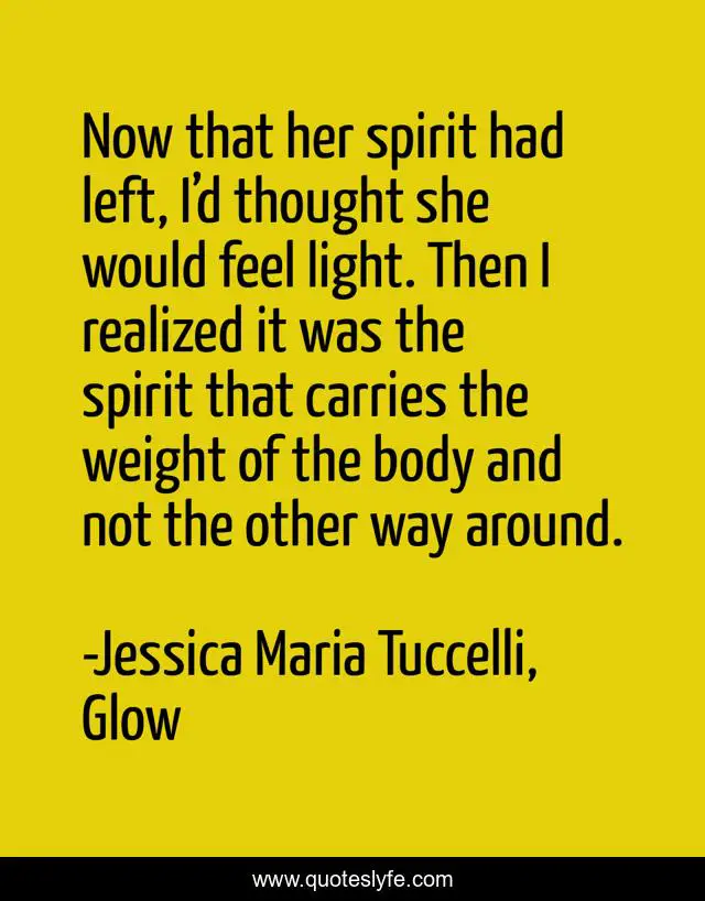 This page presents the quote "Now that her spirit had left, I’d thought she would feel light. Then I realized it was the spirit that carries the weight of the body and not the other way around.". Author of this quote is Jessica Maria Tuccelli, Glow. This quote is about death, souls, spirit,.
