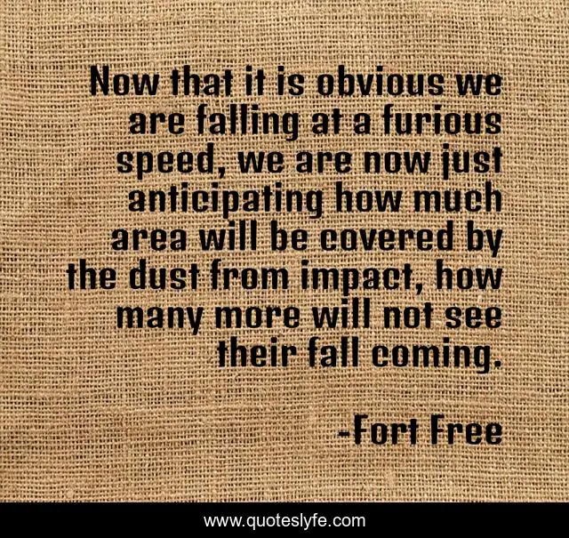 This page presents the quote "Now that it is obvious we are falling at a furious speed, we are now just anticipating how much area will be covered by the dust from impact, how many more will not see their fall coming.". Author of this quote is Fort Free. This quote is about impact, obvious, anticipating, fall, furious, falling, speed,.