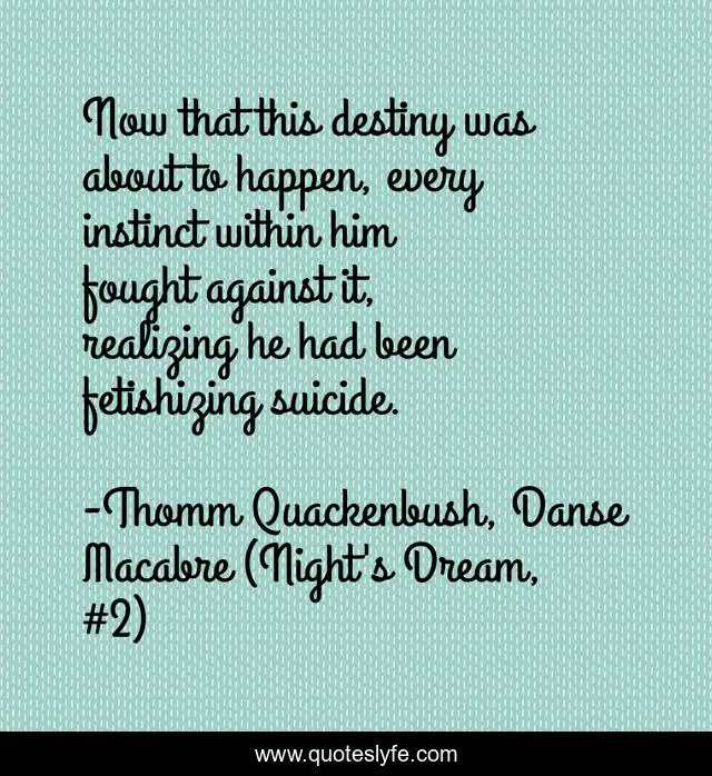 This page presents the quote "Now that this destiny was about to happen, every instinct within him fought against it, realizing he had been fetishizing suicide.". Author of this quote is Thomm Quackenbush, Danse Macabre (Night's Dream, #2). This quote is about instinct, fetish, death, suicide, destiny,.