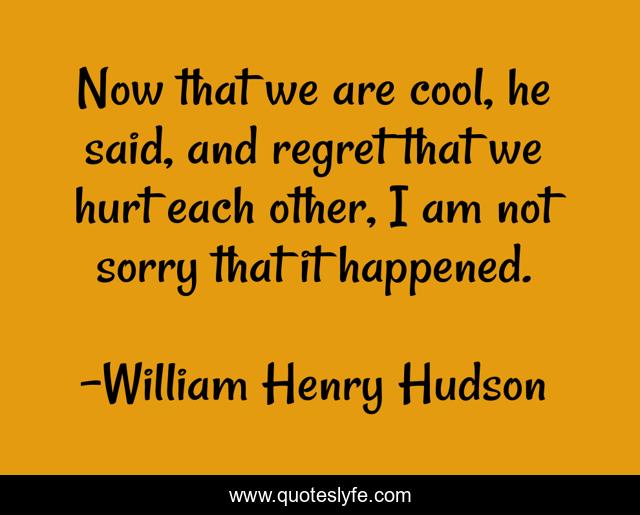 This page presents the quote "Now that we are cool, he said, and regret that we hurt each other, I am not sorry that it happened.". Author of this quote is William Henry Hudson. This quote is about regret, hurt,.