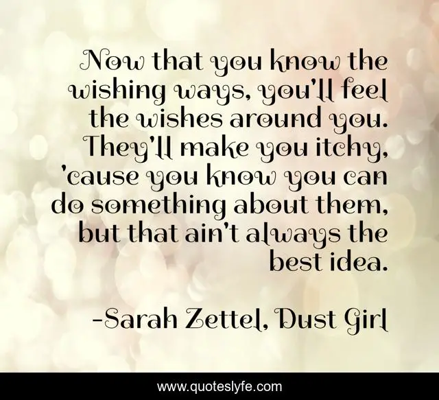 This page presents the quote "Now that you know the wishing ways, you'll feel the wishes around you. They'll make you itchy, 'cause you know you can do something about them, but that ain't always the best idea.". Author of this quote is Sarah Zettel, Dust Girl. This quote is about dust-girl, wishes, sarah-zettel,.
