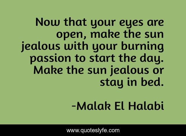 This page presents the quote "Now that your eyes are open, make the sun jealous with your burning passion to start the day. Make the sun jealous or stay in bed.". Author of this quote is Malak El Halabi. This quote is about rise-above, morning, inspiration, sun,.