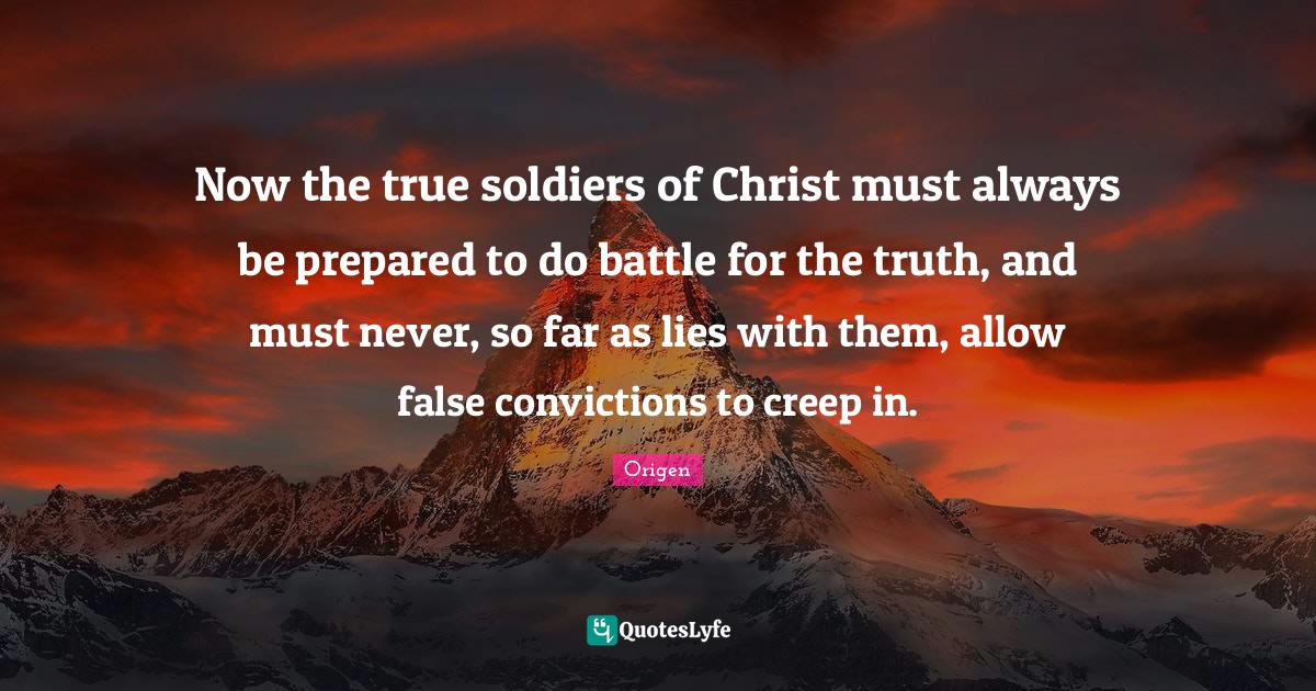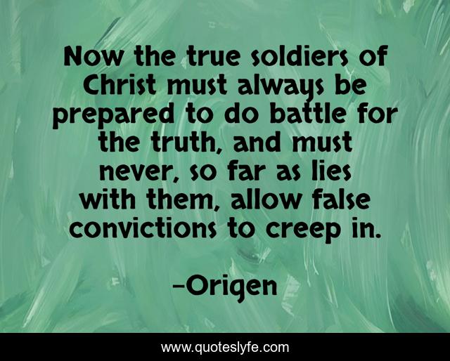 This page presents the quote "Now the true soldiers of Christ must always be prepared to do battle for the truth, and must never, so far as lies with them, allow false convictions to creep in.". Author of this quote is Origen. This quote is about battle, be prepared, truth,.
