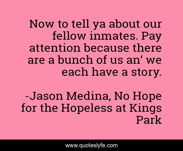 This page presents the quote "Now to tell ya about our fellow inmates. Pay attention because there are a bunch of us an’ we each have a story.". Author of this quote is Jason Medina, No Hope for the Hopeless at Kings Park. This quote is about crazy, incacerated, kings-park, prisoners, eve, building-122, hospital-ward, patients, adolescent-unit,.