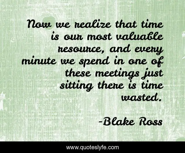 This page presents the quote "Now we realize that time is our most valuable resource, and every minute we spend in one of these meetings just sitting there is time wasted.". Author of this quote is Blake Ross. .