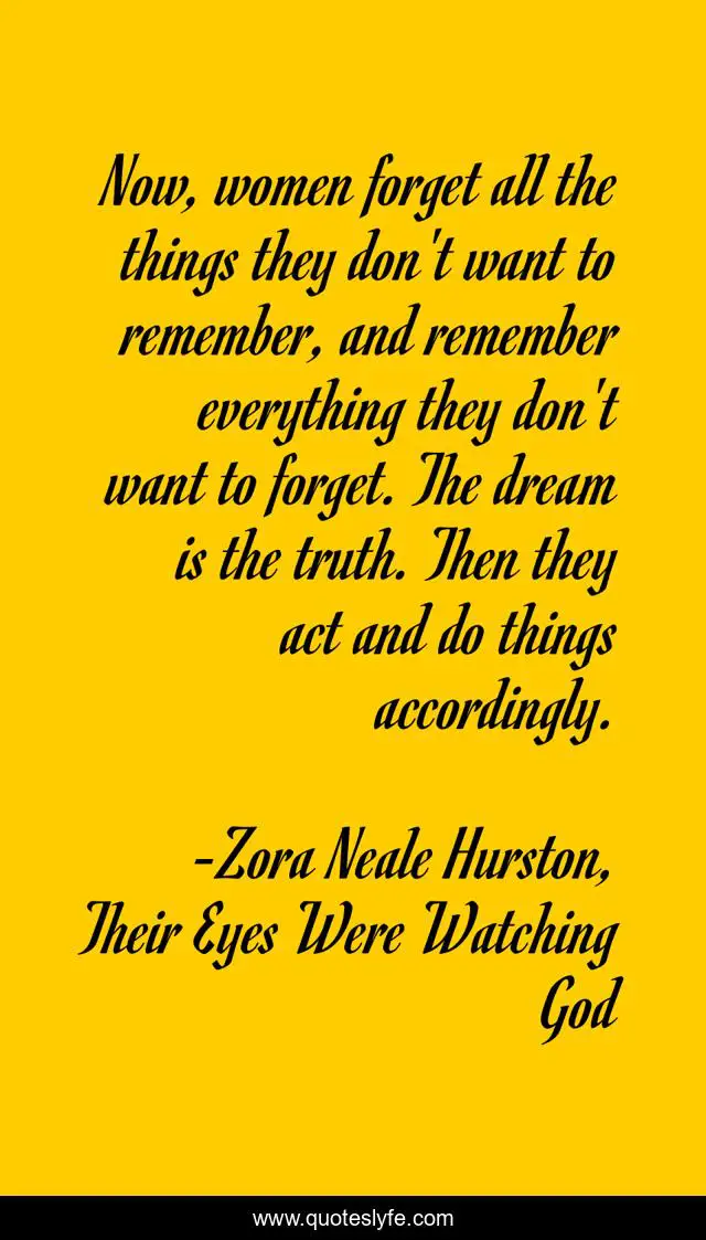 This page presents the quote "Now, women forget all the things they don't want to remember, and remember everything they don't want to forget. The dream is the truth. Then they act and do things accordingly.". Author of this quote is Zora Neale Hurston, Their Eyes Were Watching God. This quote is about men-and-women, hurston, dream, memory,.