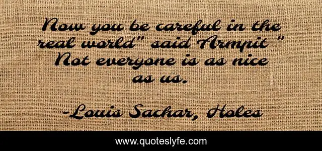 This page presents the quote "Now you be careful in the real world" said Armpit " Not everyone is as nice as us.". Author of this quote is Louis Sachar, Holes. This quote is about funny, book, holes, comedy, children-books,.