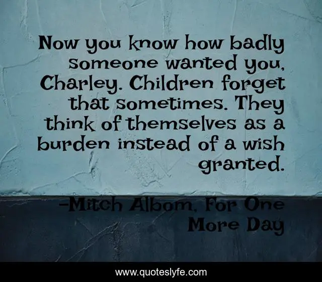 This page presents the quote "Now you know how badly someone wanted you, Charley. Children forget that sometimes. They think of themselves as a burden instead of a wish granted.". Author of this quote is Mitch Albom, For One More Day. This quote is about wish, wanted, burden, children, truth,.