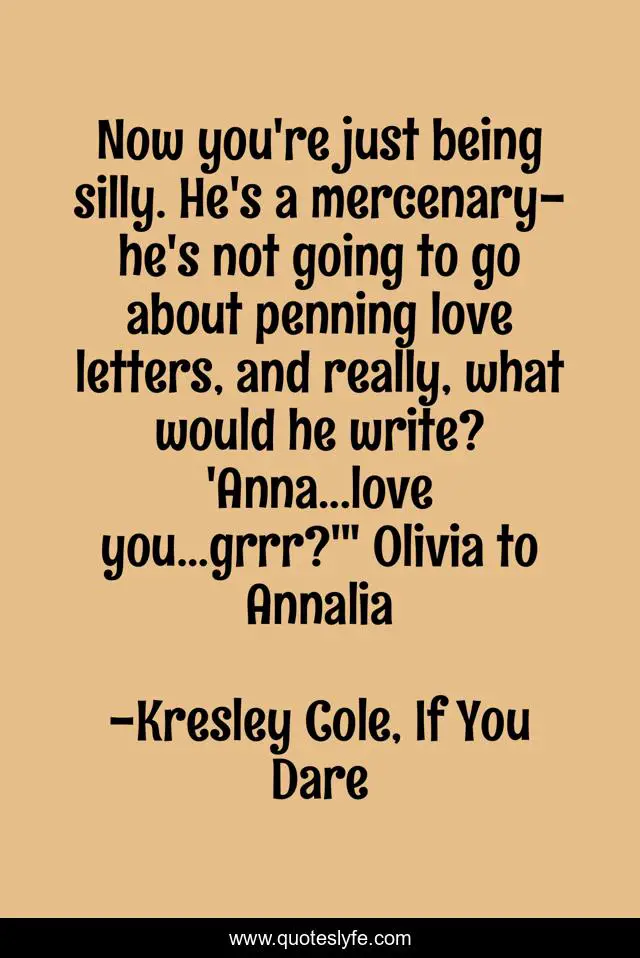 "Kresley Cole, If You Dare Quotes." Quoteslyfe.com, 2025. Fri. 05 Dec. 2025. <https://www.quoteslyfe.com/quote/Now-you-re-just-being-silly-He-55327>.