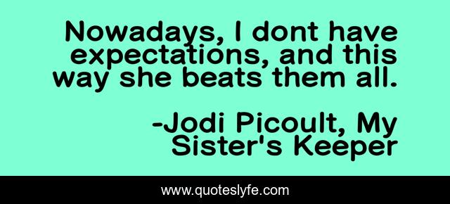 This page presents the quote "Nowadays, I dont have expectations, and this way she beats them all.". Author of this quote is Jodi Picoult, My Sister's Keeper. .