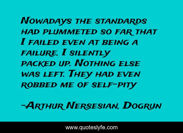 This page presents the quote "Nowadays the standards had plummeted so far that I failed even at being a failure. I silently packed up. Nothing else was left. They had even robbed me of self-pity". Author of this quote is Arthur Nersesian, Dogrun. This quote is about young-people, failure, humor, pathos, standards,.