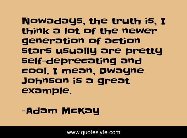 This page presents the quote "Nowadays, the truth is, I think a lot of the newer generation of action stars usually are pretty self-deprecating and cool. I mean, Dwayne Johnson is a great example.". Author of this quote is Adam McKay. This quote is about great, stars, truth,.