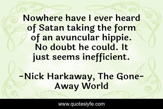 This page presents the quote "Nowhere have I ever heard of Satan taking the form of an avuncular hippie. No doubt he could. It just seems inefficient.". Author of this quote is Nick Harkaway, The Gone-Away World. This quote is about humor, satan, hippies,.