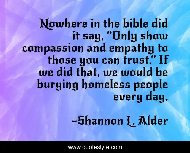 This page presents the quote "Nowhere in the bible did it say, “Only show compassion and empathy to those you can trust.” If we did that, we would be burying homeless people every day.". Author of this quote is Shannon L. Alder. This quote is about empathy, humor, laugh, service, hypocrisy, compassion, starving-people, lack-of-compassion, karma,.