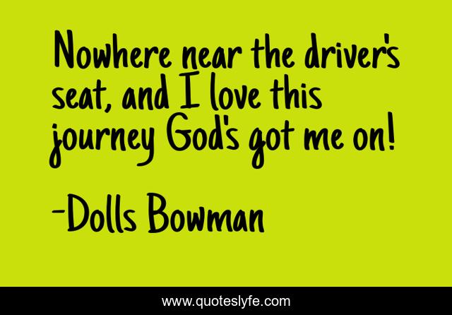 This page presents the quote "Nowhere near the driver's seat, and I love this journey God's got me on!". Author of this quote is Dolls Bowman. This quote is about letting-god-drive, driver-s-seat, journey,.