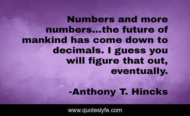 This page presents the quote "Numbers and more numbers...the future of mankind has come down to decimals. I guess you will figure that out, eventually.". Author of this quote is Anthony T. Hincks. This quote is about figure, philosophy, future, figures, mankind, decimals, numbers,.
