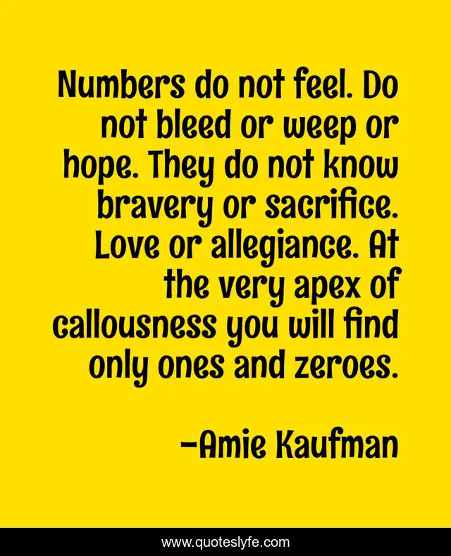 This page presents the quote "Numbers do not feel. Do not bleed or weep or hope. They do not know bravery or sacrifice. Love or allegiance. At the very apex of callousness you will find only ones and zeroes.". Author of this quote is Amie Kaufman. This quote is about love, artificial-intelligence, sacrifice, hope, robots, numbers, maths, affection,.