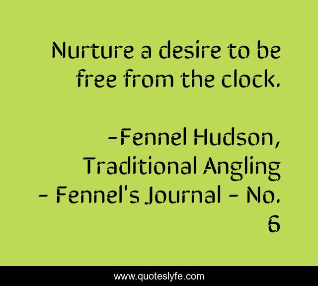 This page presents the quote "Nurture a desire to be free from the clock.". Author of this quote is Fennel Hudson, Traditional Angling - Fennel's Journal - No. 6. This quote is about freedom, escape, timeless, time,.
