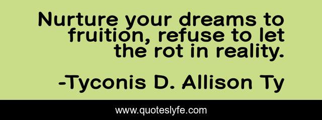 This page presents the quote "Nurture your dreams to fruition, refuse to let the rot in reality.". Author of this quote is Tyconis D. Allison Ty. This quote is about motivation, dreams, hope, inspiration,.