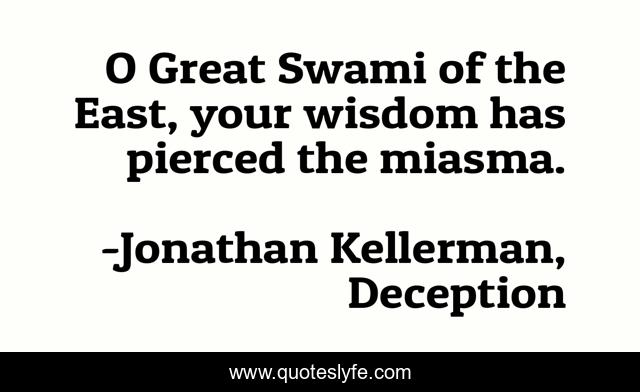 This page presents the quote "O Great Swami of the East, your wisdom has pierced the miasma.". Author of this quote is Jonathan Kellerman, Deception. .