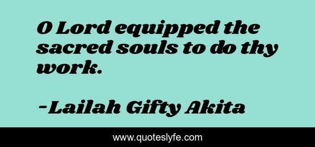 This page presents the quote "O Lord equipped the sacred souls to do thy work.". Author of this quote is Lailah Gifty Akita. This quote is about god, prayer, souls, mission,.