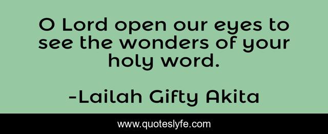 This page presents the quote "O Lord open our eyes to see the wonders of your holy word.". Author of this quote is Lailah Gifty Akita. This quote is about christian, religious-faith, holy-bible, see, praying, inspiration,.