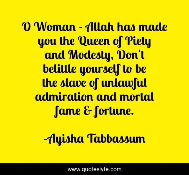 This page presents the quote "O Woman - Allah has made you the Queen of Piety and Modesty, Don't belittle yourself to be the slave of unlawful admiration and mortal fame & fortune.". Author of this quote is Ayisha Tabbassum. This quote is about modesty, woman, beauty, religion-and-philosophy, goodness, fame-and-fortune, islam,.