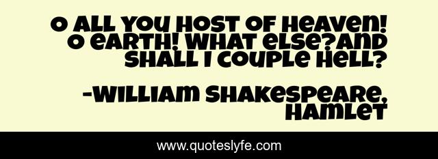 This page presents the quote "O all you host of heaven! O earth! What else?And shall I couple Hell?". Author of this quote is William Shakespeare, Hamlet. This quote is about grief, distress, horror, heaven-and-hell, what-else, injustice, heaven-and-earth, fear, anguish,.